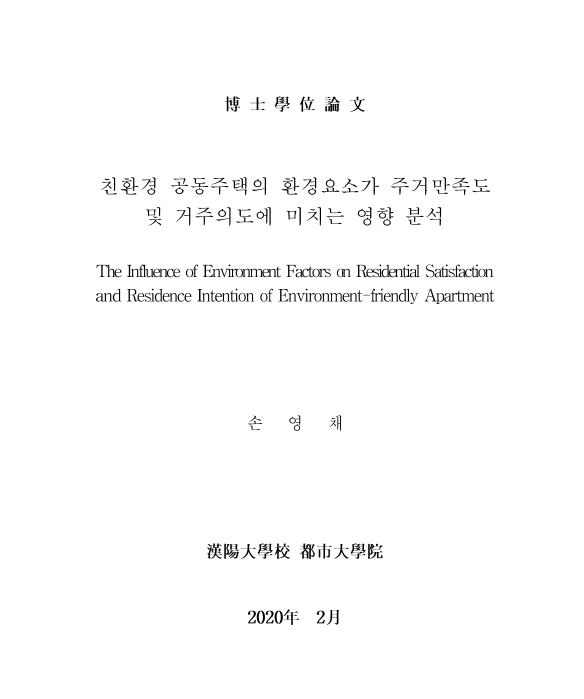 친환경 공동주택의 환경요소가 주거만족도 및 거주의도에 미치는 영향분석 > thesis