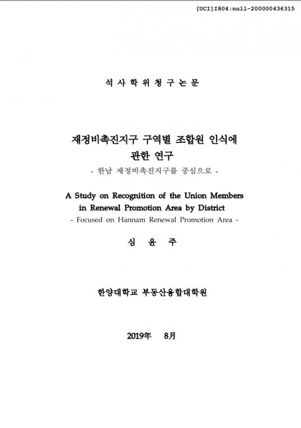재정비촉진지구 구역별 조합원 인식에 관한 연구 -한남 재정비촉진지구를 중심으로- > thesis_master