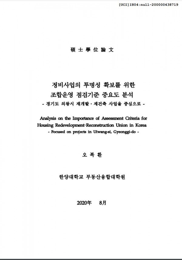 페이지 정보 본문 [정비사업의 투명성 확보를 위한 조합운영 점검기준 중요도 분석 : 경기도 의왕시 재개발·재건축 사업을 중심으로] 오복환(2020) 석사학위논문 관련링크 이전글 다음글 목록