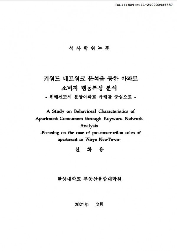 키워드 네트워크 분석을 통한 아파트 소비자 행동특성 분석 : 위례신도시 분양아파트 사례를 중심으로 > thesis_master