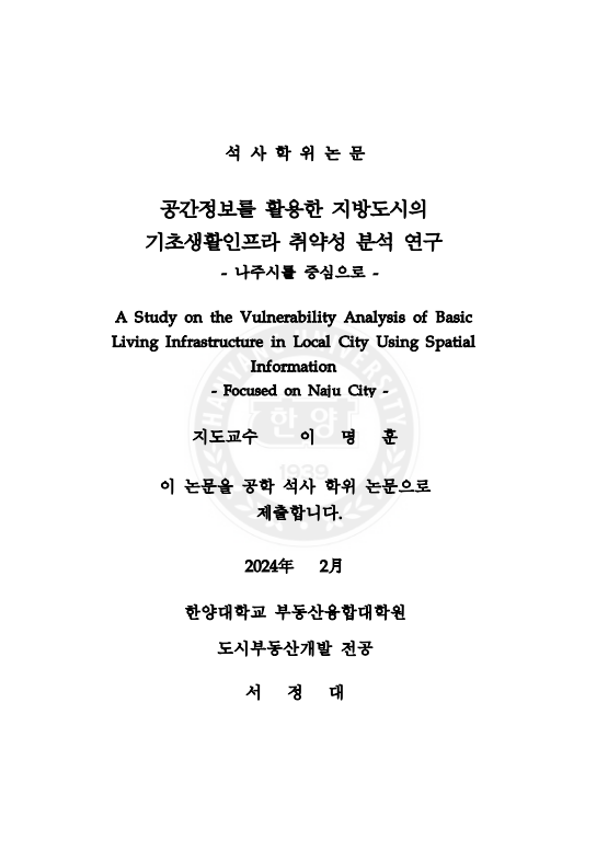 공간정보를 활용한 지방도시의 기초생활인프라 취약성 분석 연구 : 나주시를 중심으로 > thesis_master