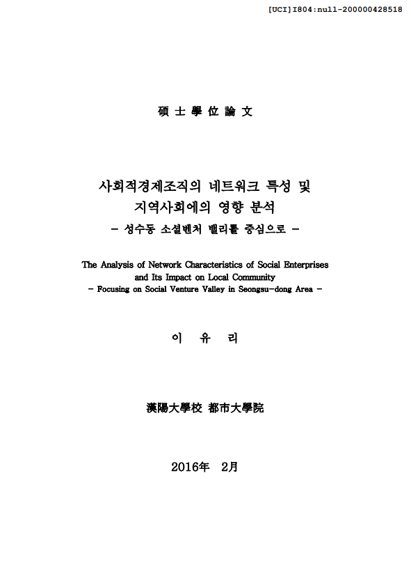 사회적경제조직의 네트워크 특성 및 지역사회에의 영향 분석 : 성수동 소셜벤처 밸리를 중심으로 > thesis_master