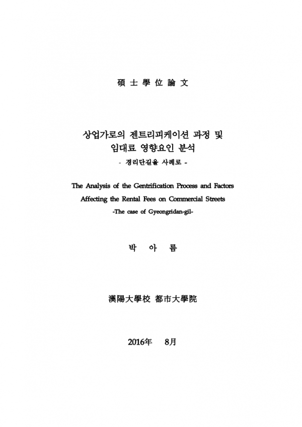 상업가로의 젠트리피케이션 과정 및 임대료 영향요인 분석 경리단길을 사례로 > thesis_master