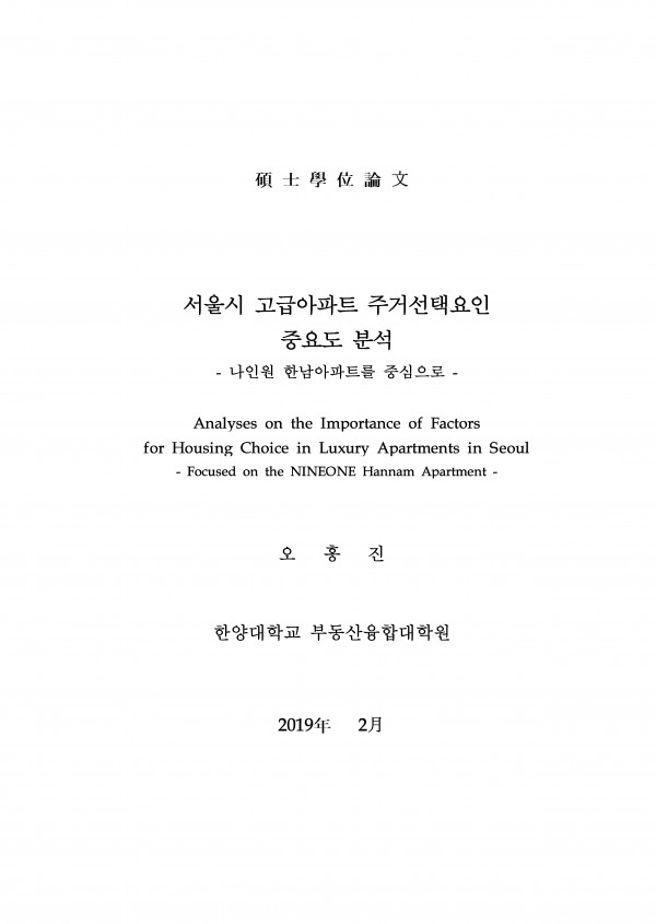 서울시 고급아파트 주거선택요인 중요도 분석 : 나인원 한남아파트를 중심으로 > thesis_master